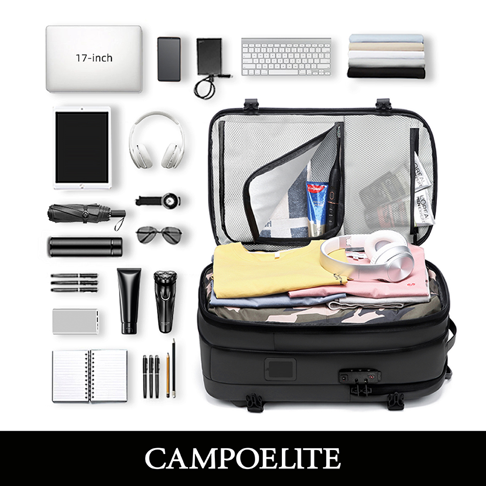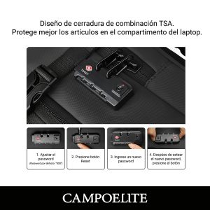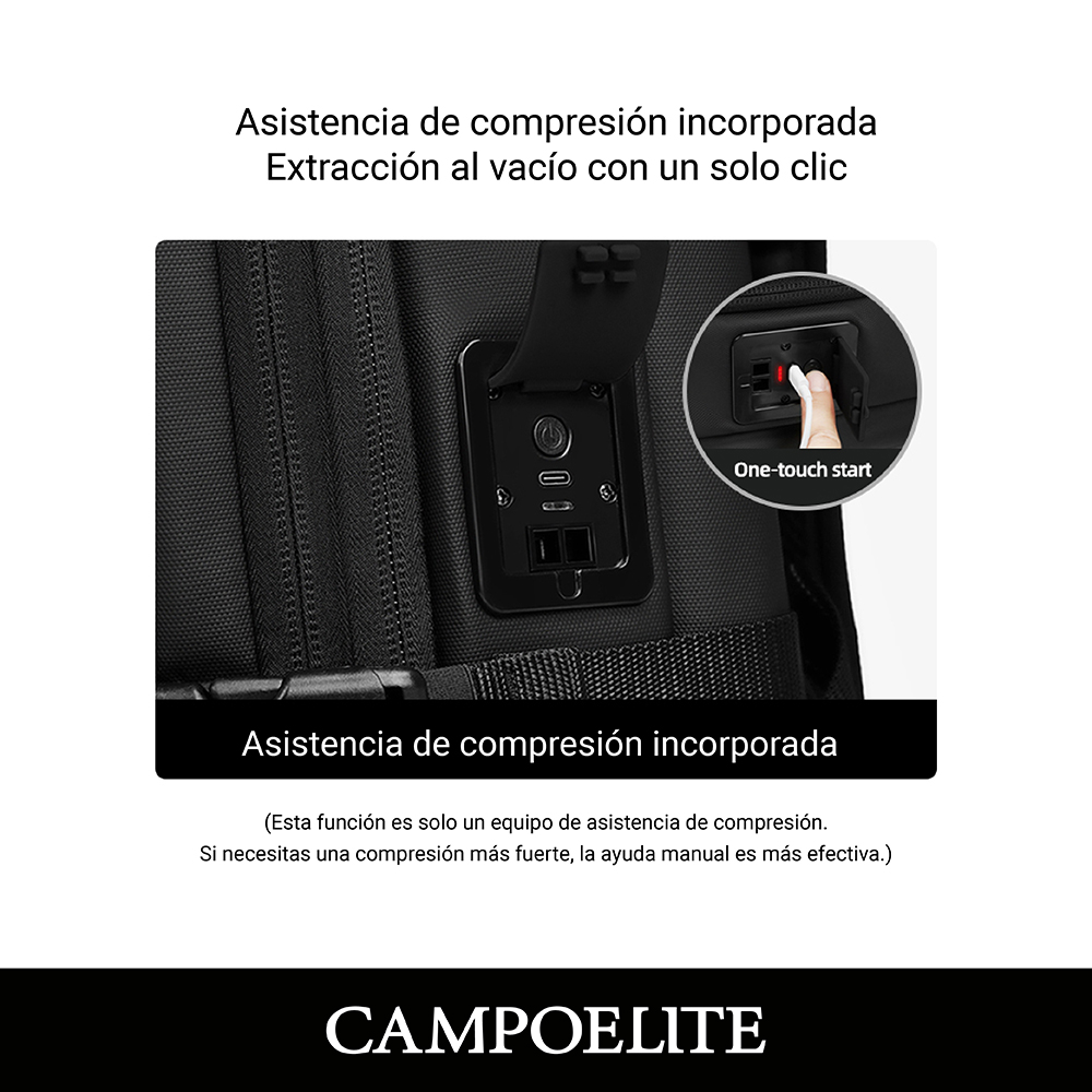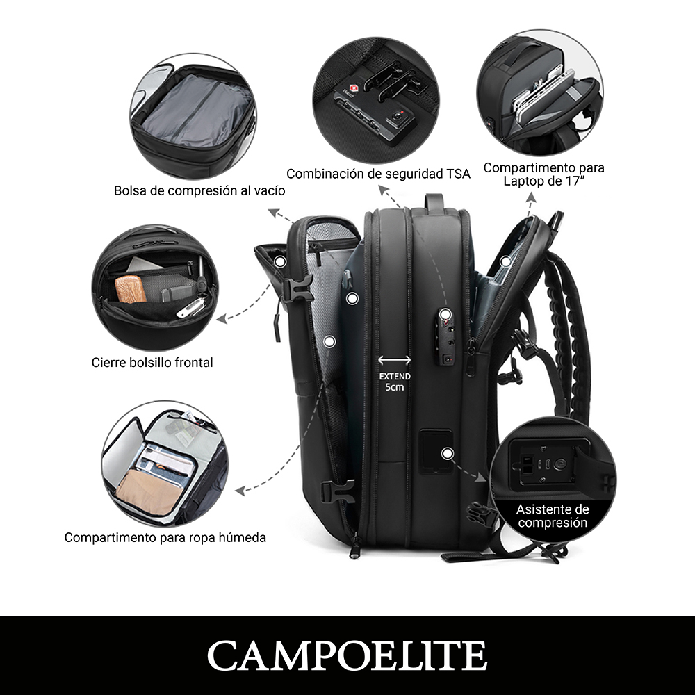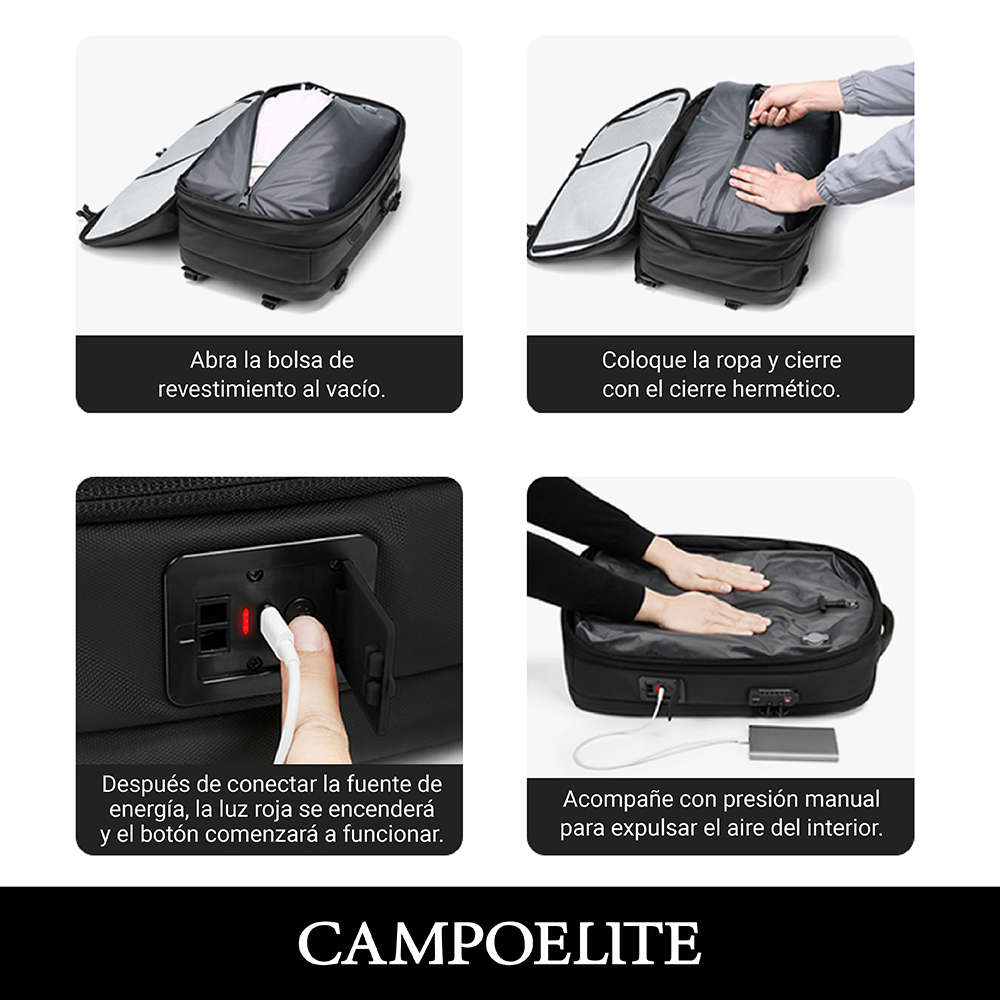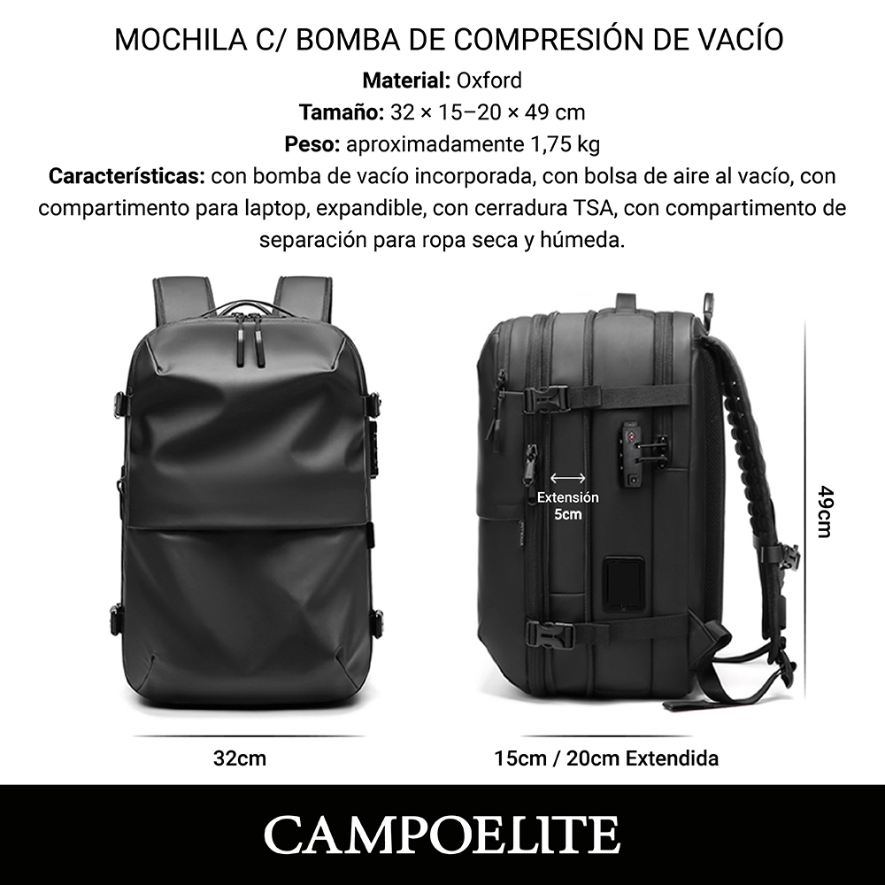 Mochila de viaje inteligente con bomba de vacío incorporada, expandible, resistente y equipada con cerradura TSA. Incluye compartimento para laptop, cierres SBS y diseño reforzado para mayor durabilidad.